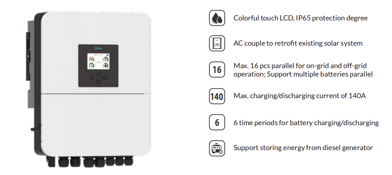 Oui ! L’onduleur hybride Deye fournit une alimentation de secours instantanée en moins de 20 millisecondes en cas de coupure de courant, assurant ainsi le bon fonctionnement de vos lumières, de votre réfrigérateur et de vos appareils électroménagers essentiels. Un système de batterie compatible est nécessaire pour cette fonction de secours.